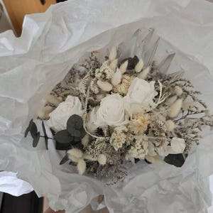 A very beautiful bouquet with a matching hair comb and suit pin! If you didn't know, you wouldn't notice that the flowers are dried. This saves you the hassle of drying and preserving after the wedding. I would definitely order again!
